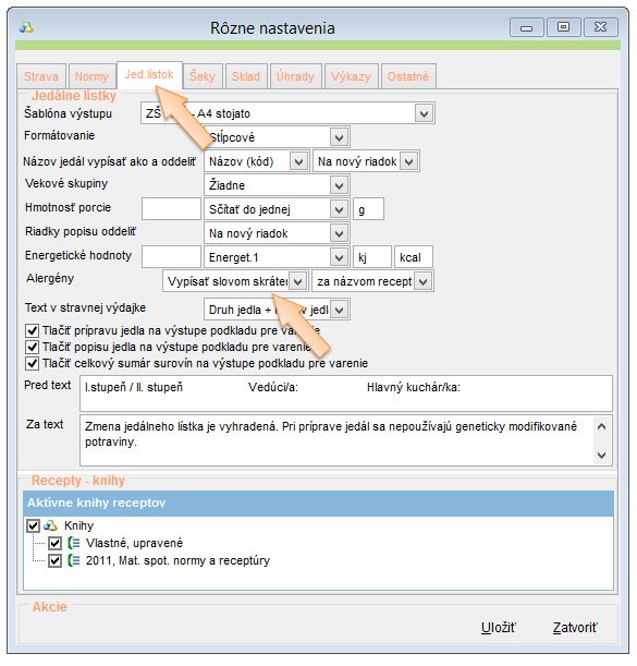 - Spôsob vypisovania alergénov na jedálnom lístku - v nastaveniach aplikácie, v časti Rôzne, záložka Jedálny lístok je možné nadefinovať, akým spôsobom sa na jedálnom lístku budú alergény vypisovať.
