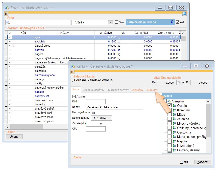 - Kliknite na Pridať a vyhľadajte surovinu. (V našom prípade Čerešne - školské ovocie.)