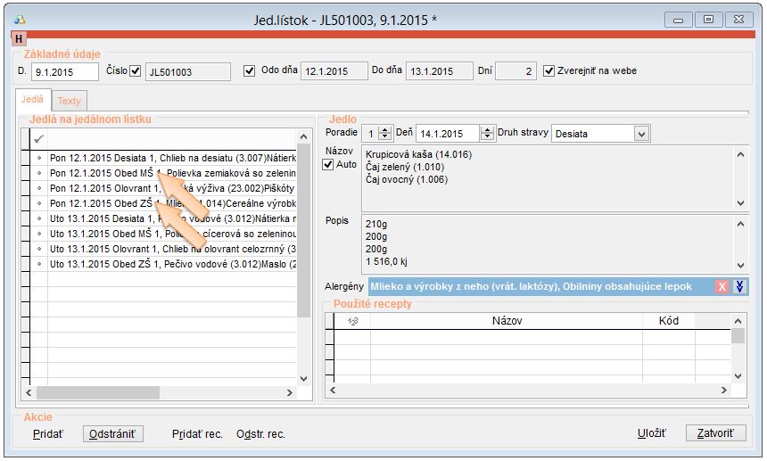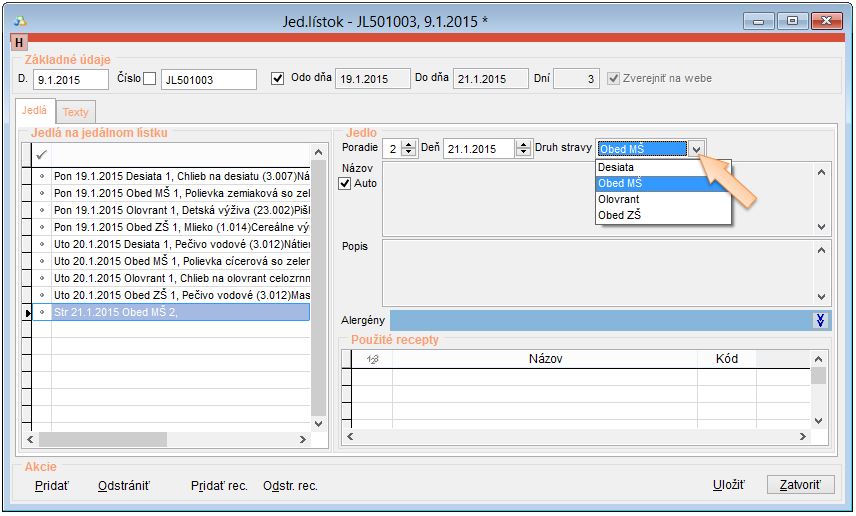 1. Ak ste nadefinovali v nastaveniach v časti Číselné rady druhov aj nový druh pre Jedálne lístky, vyberte v stĺpci Druh jedálneho lístka aj nadefinovaný tento druh.