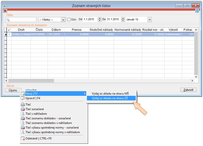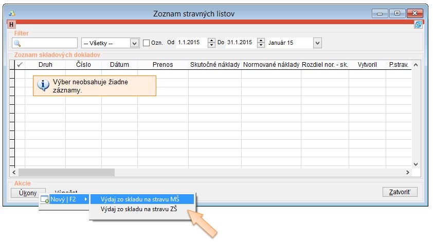 2. Kliknite na tlačidlo Úkony -> Nový a vyberte druh stravného listu. (Ďalšie informácie o stravných listoch a ich vytvorení sa dozviete v ONLINE video kurze iKelp Jedáleň - ONLINE videokurz v časti Skladová evidencia v lekcii číslo 8, alebo v návode Stravná výdajka.)