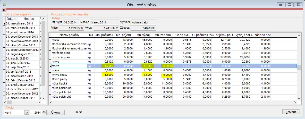 3. V našom konkrétnom prípade sme zistili, že prvý krát sa nám na výkaze takáto nezrovnalosť objavila v Marci. Na to, aby sme jednotlivé stravné listy vedeli skontrolovať a prípadné zmeny uložiť, musíme odstrániť vytvorené obratové súpisky. Pred odstránením obratových súpisiek si poznačte množstvo a cenu za ktorú bol tovar prijatý a vydaný aby ste tak presne vedeli dohladať v ktorej príjemke a výdajke bol tovar prijatý a vydaný. Bližšie informácie o pregenerovaní "Obratovej súpisky" sa dočítate v návode Nie je možné upraviť starší skladový doklad, tlačidlo "Uložiť" je zašednuté