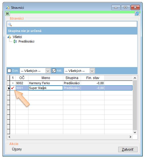 • Vybraným stravníkom sa zapíše, že v daný deň, alebo rozsahu im bola strava vydaná. Strava sa vydá na stravníka v celkovom počte objednaných jedál na daný deň, na všetky druhy na ktoré bol stravník prihlásný.