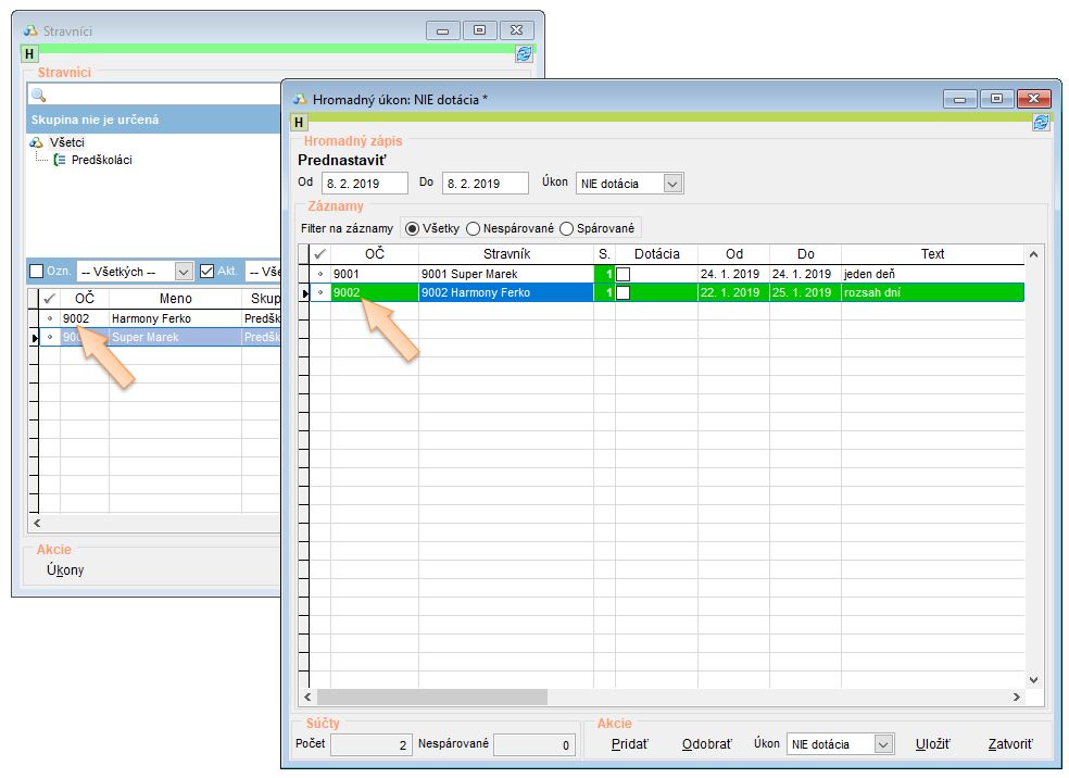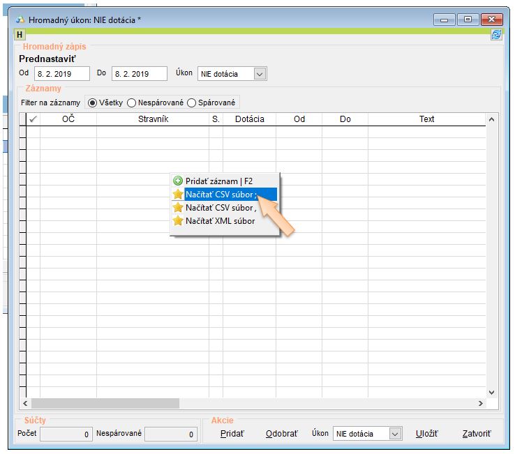 • Pri následnom importe a nastavení NIE dotácia je vybraným stravníkom zrušený nárok na dotáciu.
