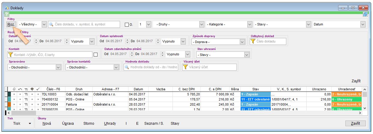 Po kliknutí na tlačítko Roz. se zobrazí okno Filtr, pomocí kterého je možné doklady přesněji filtrovat.