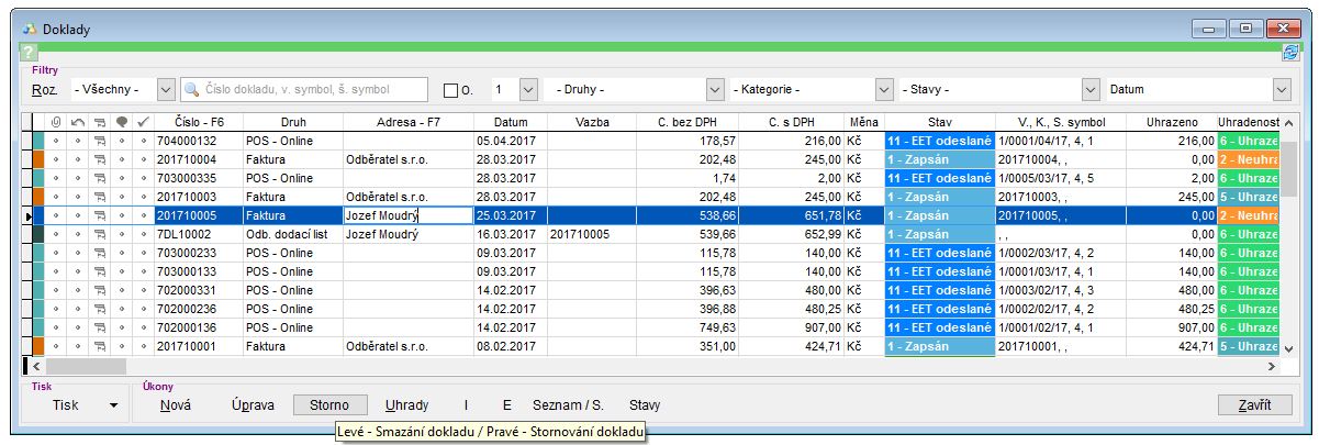 - Storno dokladu vykonáte tak, že kliknete na daný doklad v seznamu dokladů, čímž se doklad označí.
