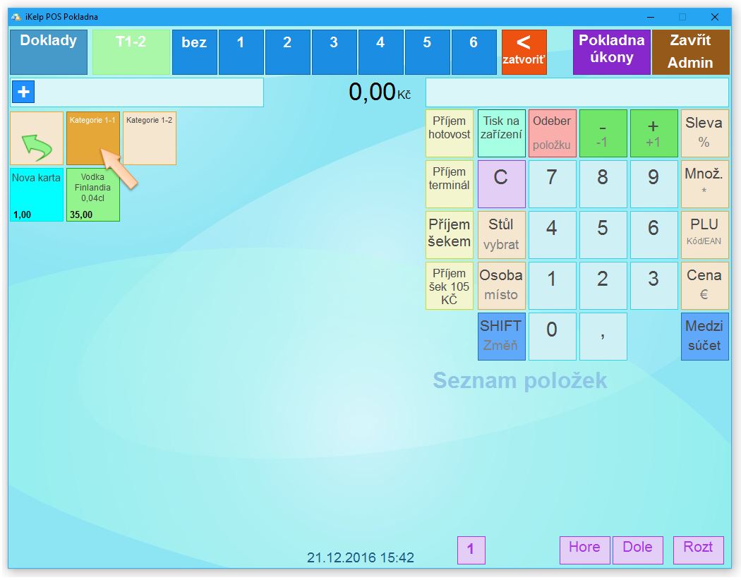 V tomto návodu vám vysvětlíme, jakým způsobem je možné přidávat položky do prodeje v aplikaci iKelp Pokladna. Aplikace umožňuje různé způsoby přidávání položek do prodeje a dále vám jednotlivé možnosti blíže popíšeme. Aby bylo možné položku na doklad přidat, je potřebné spustit aplikaci a otevřít nový doklad. V případě restauračního režimu aplikace je potřebné si vybrat místnost a následně stůl, na kterém se má nový doklad vytvořit.