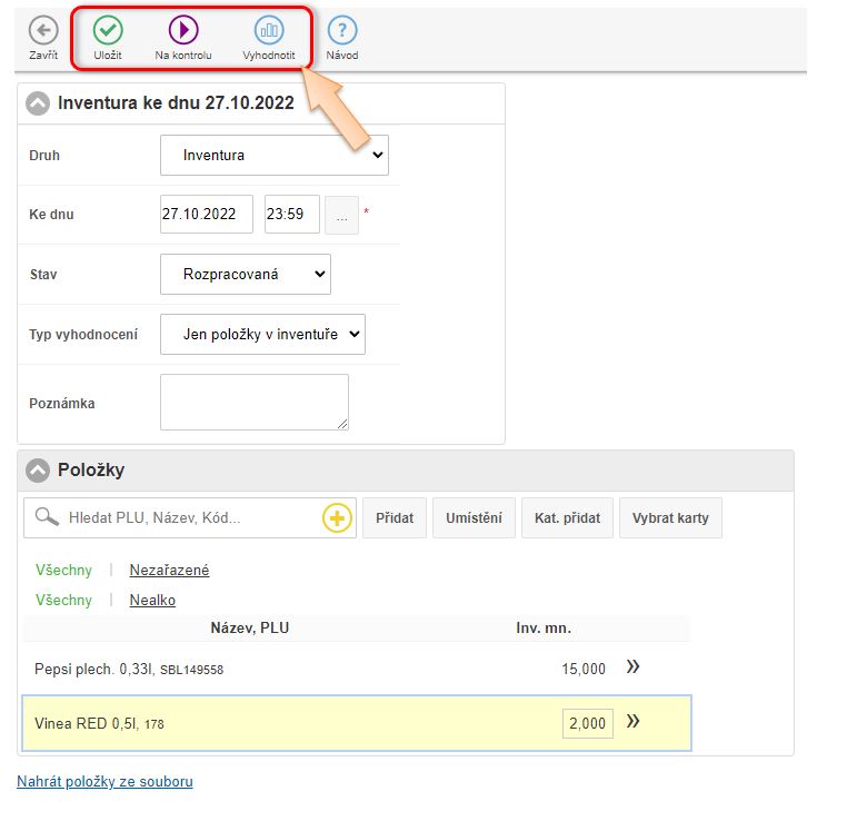 - Vyhodnotit - inventura se uloží a zobrazí se vyhodnocení inventury.