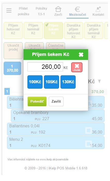 V tomto návodu vám vysvětlíme, jakým způsobem je možné v aplikaci iKelp POS Mobile vykonat částkovou - kombinovanou úhradu. Zaevidování částkové úhrady je vhodné tehdy, když se zákazník rozhodne část uhradit např. stravenkami a zbytek hotovostí, případně chce část uhradit v hotovosti a zbytek doplatit kartou. Rozpis platidel tak zákazník následně vidí na dokladu, rovněž tak v případě zapnuté evidence platidel je tento rozpis vidět i na denní, případně intervalové uzávěrce.