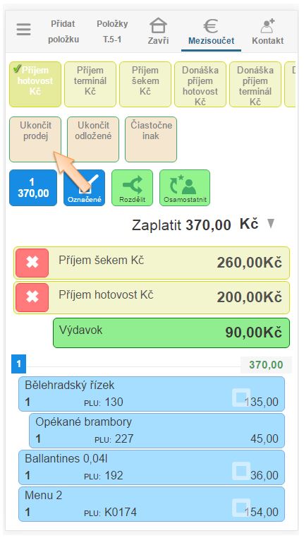 6. Klikněte na tlačítko platidla, kterým se má doplatit zbývající suma a následně ukončete doklad kliknutím na Ukončit prodej. (Aplikace automaticky dopočítá kolik je potřebné doplatit.).