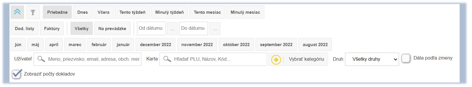 - Všetky - zobrazenie všetkých dokladov účtovaných nie len na prevádzke.