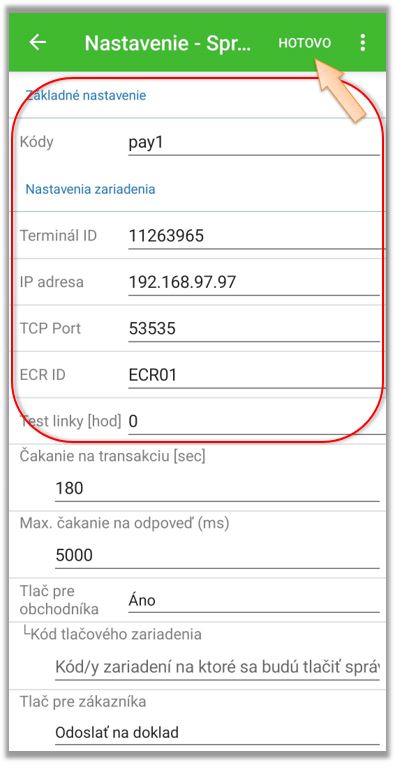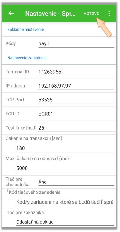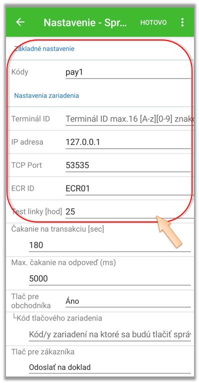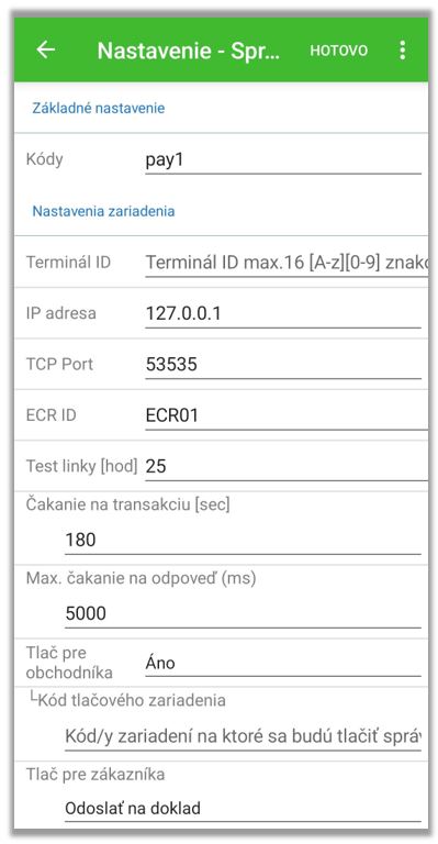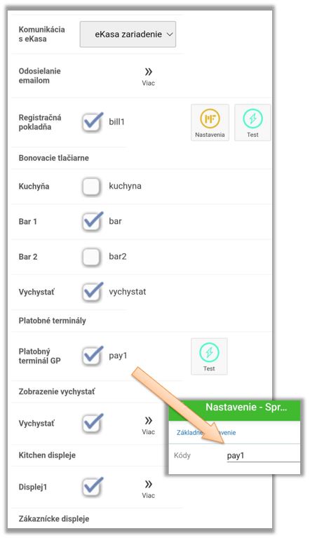 1. Kódy - zajte kód zariadenia podľa predajnej aplikácie. Ak sa jedná o ďalší terminál v poradí, upravte poradové číslo. (Napr. pay2, pay3 a pod...)
