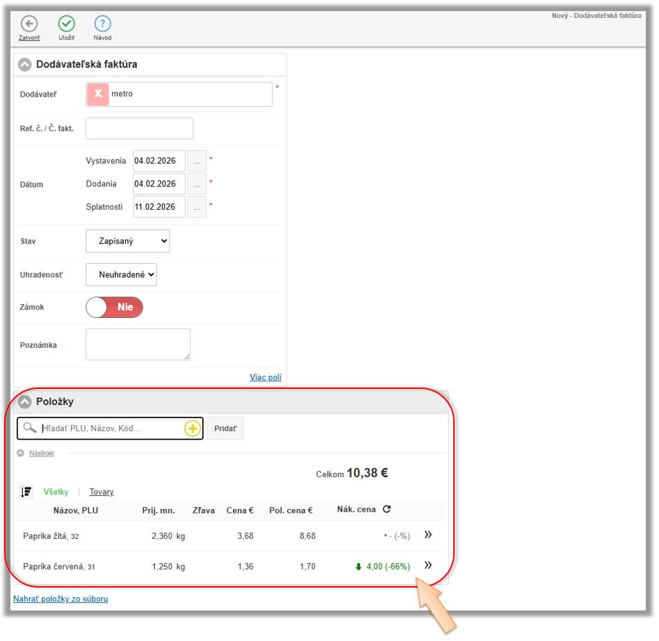 Tento scenár evidencie znovu opíšeme na príklade papriky. Dodávateľ na doklade účtuje papriku ako 1ks - Paprika biela debnička 10kg, ale aby systém vedel správne odpisovať surovinu definovanú v receptúrach, potrebujete to prijať rovno ako paprika biela 10kg. V tomto prípade sa tovar naskladňuje a eviduje na sklade v inej mernej jednotke a v inom počte ako je na doklade od dodávateľa.