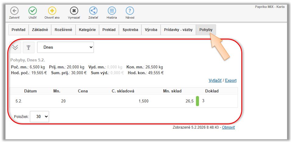 - Karta typu Surovina. (V našom prípade Paprika MIX.)