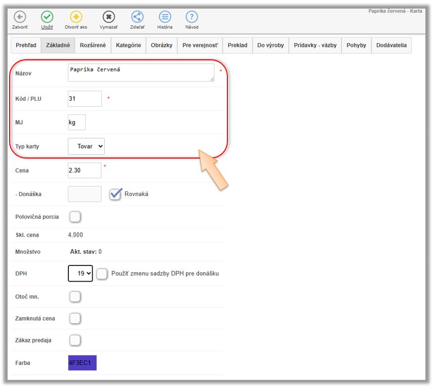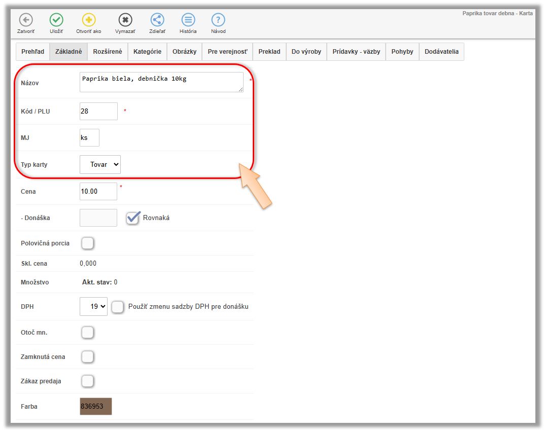 - Karta typu Tovar pre jednotlivé tovary od dodávateľa. (V našom prípade - Paprika biela, debnička 10kg.)