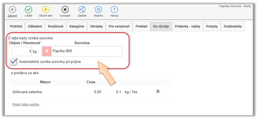 - Nastavte, že z 1kg tejto karty vzniká surovina. (V našom prípade Paprika MIX.)