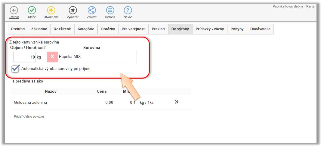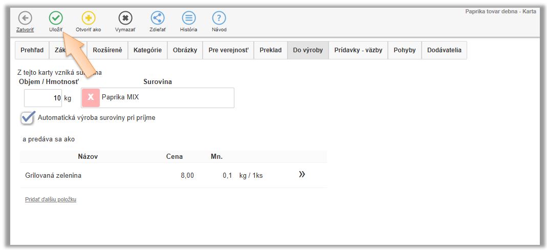 - Nastavte, že z tejto karty vzniká 10kg surovina. (V našom prípade Paprika MIX.)