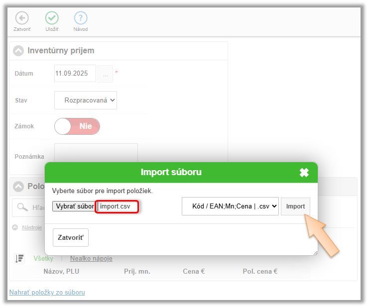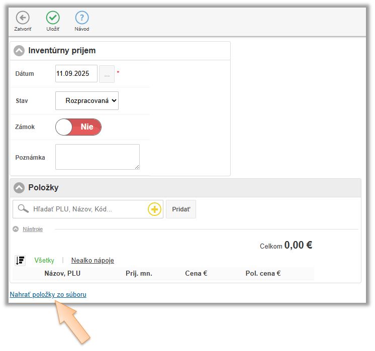 Po kliknutí na tlačidlo + Príjemka v skladovej časti aplikácie, sa zobrazí okno s možnosťami pre príjem tovaru na sklad.