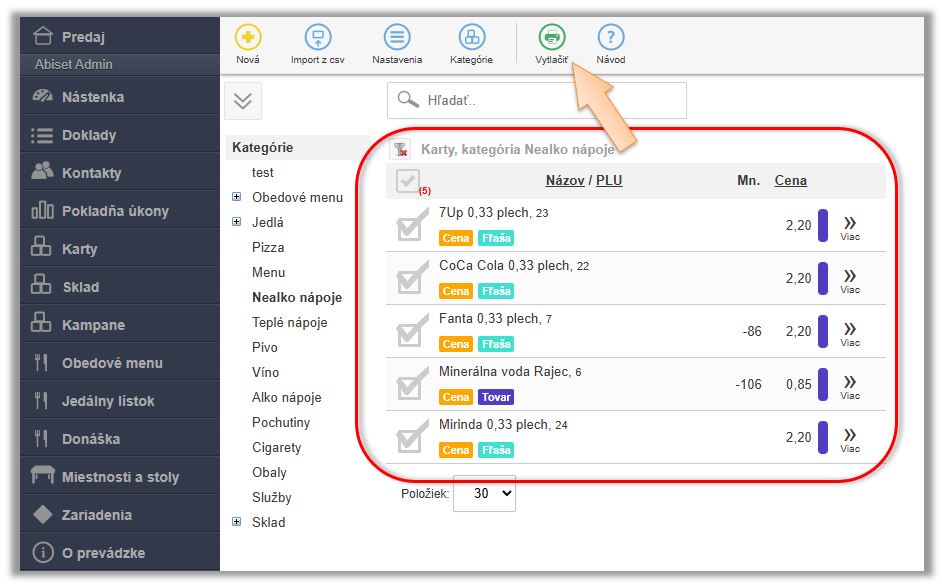 - Nastavte si požadované parametre pre tlač. (Napr. výberom ceny na cenovke Základná/Cenníková/Rozvoz.)