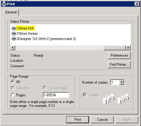 - Zobrazí sa Vám okno s ponukou nainštalovaných tlačiarní, vyberte tlačiareň s názvom "TSPrint PDF".