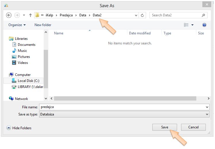 - Otvorte vytvorený adresár a kliknite na tlačidlo Uložiť. (Názov dátového súboru nemusíte meniť, databázu si môžte pomenovať po jej vytvorení. Viac o nastaveniach a umiestneniach jednotlivých dátových a konfiguračných súborov aplikácie sa dočítate v návode Nastavenia - konfiguračné súbory.)