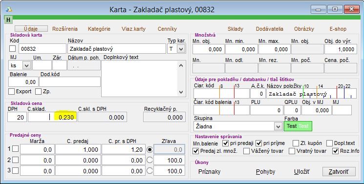 - Skladová karta bola založená, ale tovar nebol prijatý na sklad no niektoré kusy sa už predali a chcete stav skladu vyrovnať inventúrou aby ste nemuseli dodatočne nahadzovať príjemky. Vtedy je potrebné otvoriť danú skladovú kartu na úpravu a skladovú cenu sem doplniť ručne.