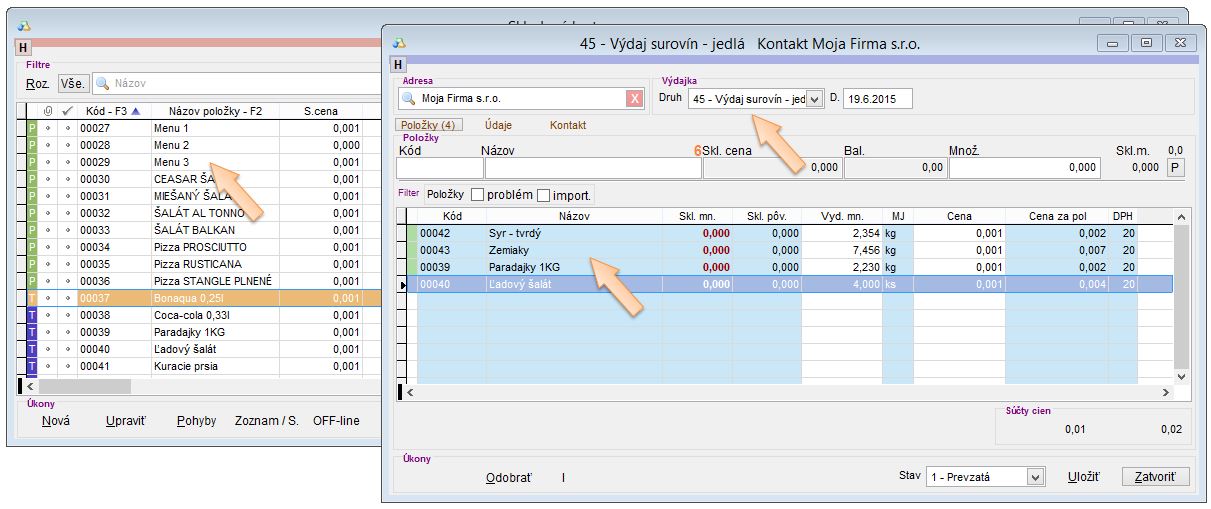 - Ak z pohľadu kuchyne nie je potrebná detailná evidencia skladu. Karty či už denného menu alebo jednotlivých jedál sú evidované ako karty typu "Práca" a k odpisu surovín zo skladu dochádza ich priamim výdajom. (Predávajú sa jedlá a denné menu, ale odpis surovín zo skladu prebehne skladovou výdajkou.)