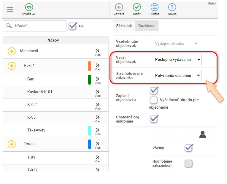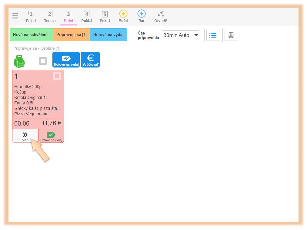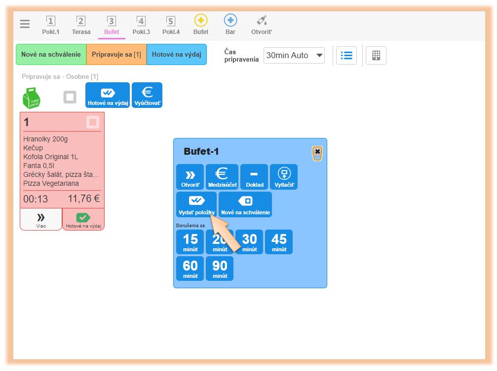 Bufet s postupným výdajom položiek z objednávky a zobrazenie na výdajovom displeji