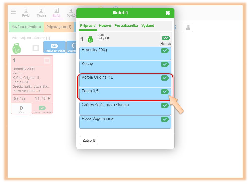 - Obsluha v zozname položiek vidí, ktoré položky už boli z objednávky vydané zákazníkovi. Tieto sú prečiarknuté.