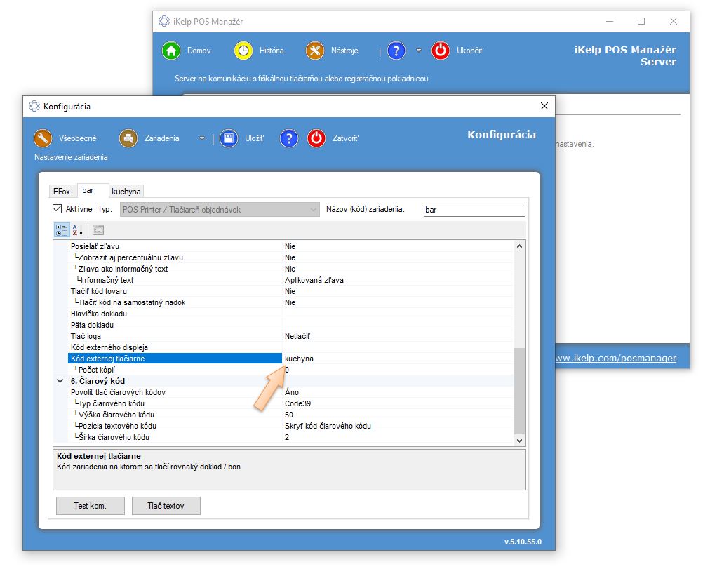 V oboch prípadoch je potrebné zariadeniu v rámci konfigurácie nastaviť správny Názov (kód) zariadenia, ktorý musí byť zhodný s názvom zariadenia v aplikácii POS Mobile. Následne už spojenie so zariadením zabezpečuje aplikácia POS Manažér, je teda možné na danom zariadení tlačiť z ktoréhokoľvek predajného miesta. Pozor v prípade sieťových tlačiarní, zariadenie sa definuje len v rámci jednej aplikácie iKelp POS Manažér. Ak máte nakonfigurované jedno fyzické zariadenie, s jedným kódom v dvoch aplikáciach na dvoch PC súčasne, je potrebné v rámci jednej konfigurácie zariadenie deaktivovať!