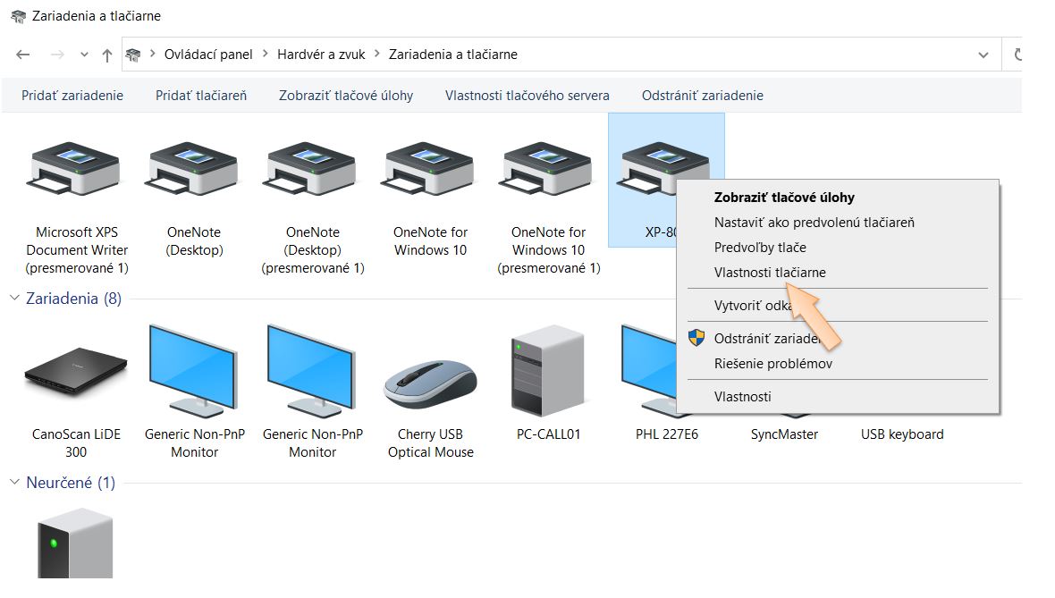 3. Kliknite pravým tlačidlom myši na danú tlačiareň a vyberte Vlastnosti tlačiarne.