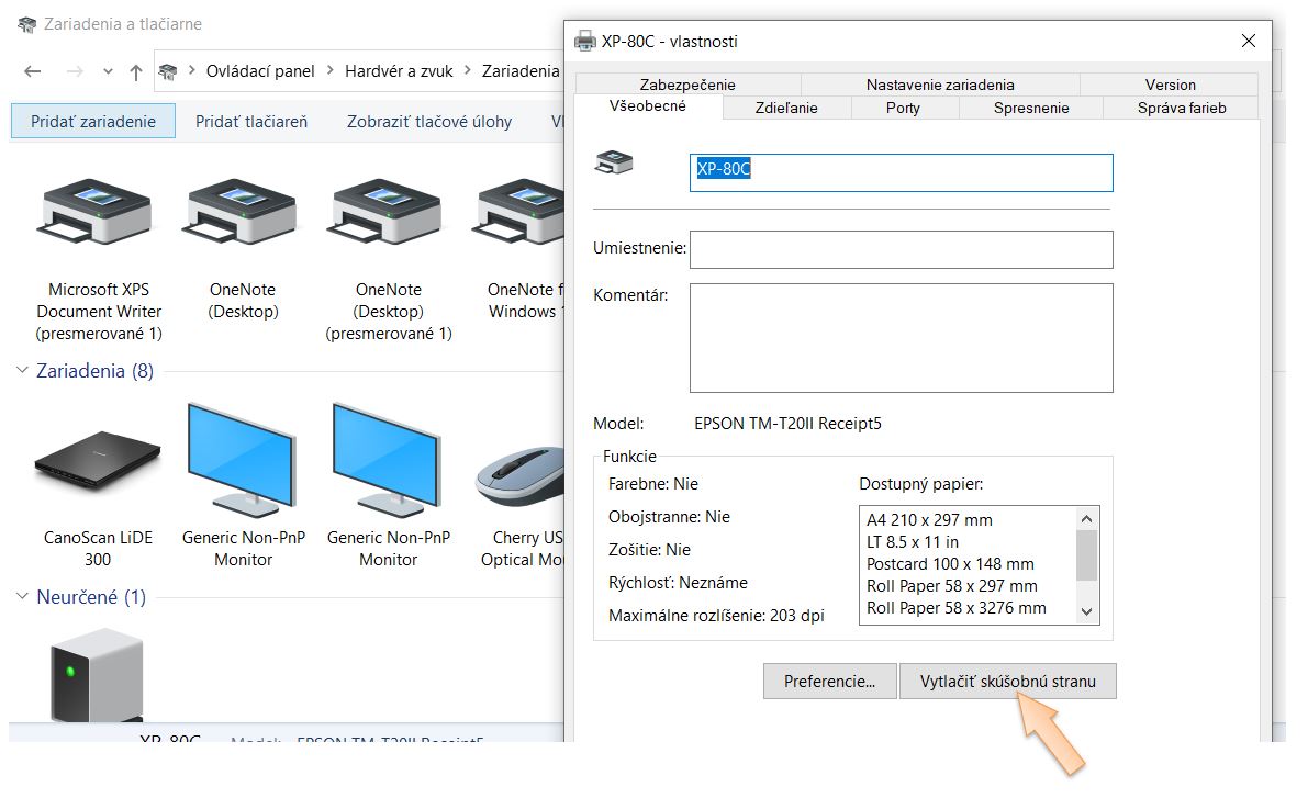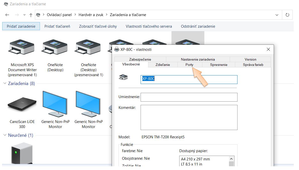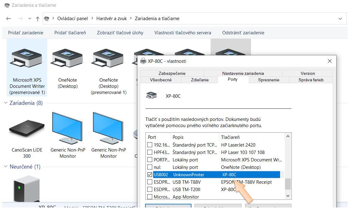 • Tento problém sa môže vyskytnúť po aktualizácii OS Windows (hlavne pri lacnejších tlačiarňach dôjde k prestaveniu prednastaveného portu zariadenia napr. Rongda, Xprinter... ). Následne je potrebné v nastaveniach zariadenia prideliť zariadeniu správny port, cez ktorý má v systéme komunikovať.