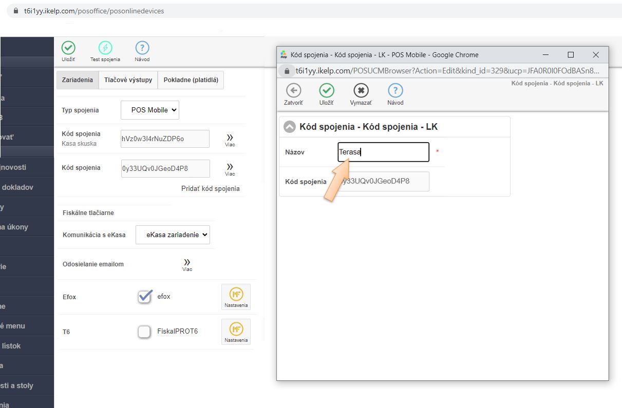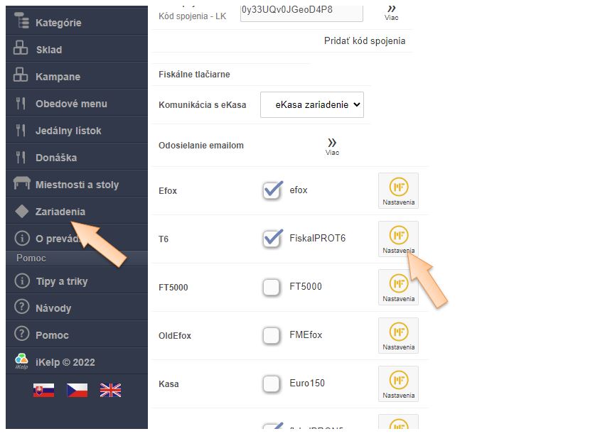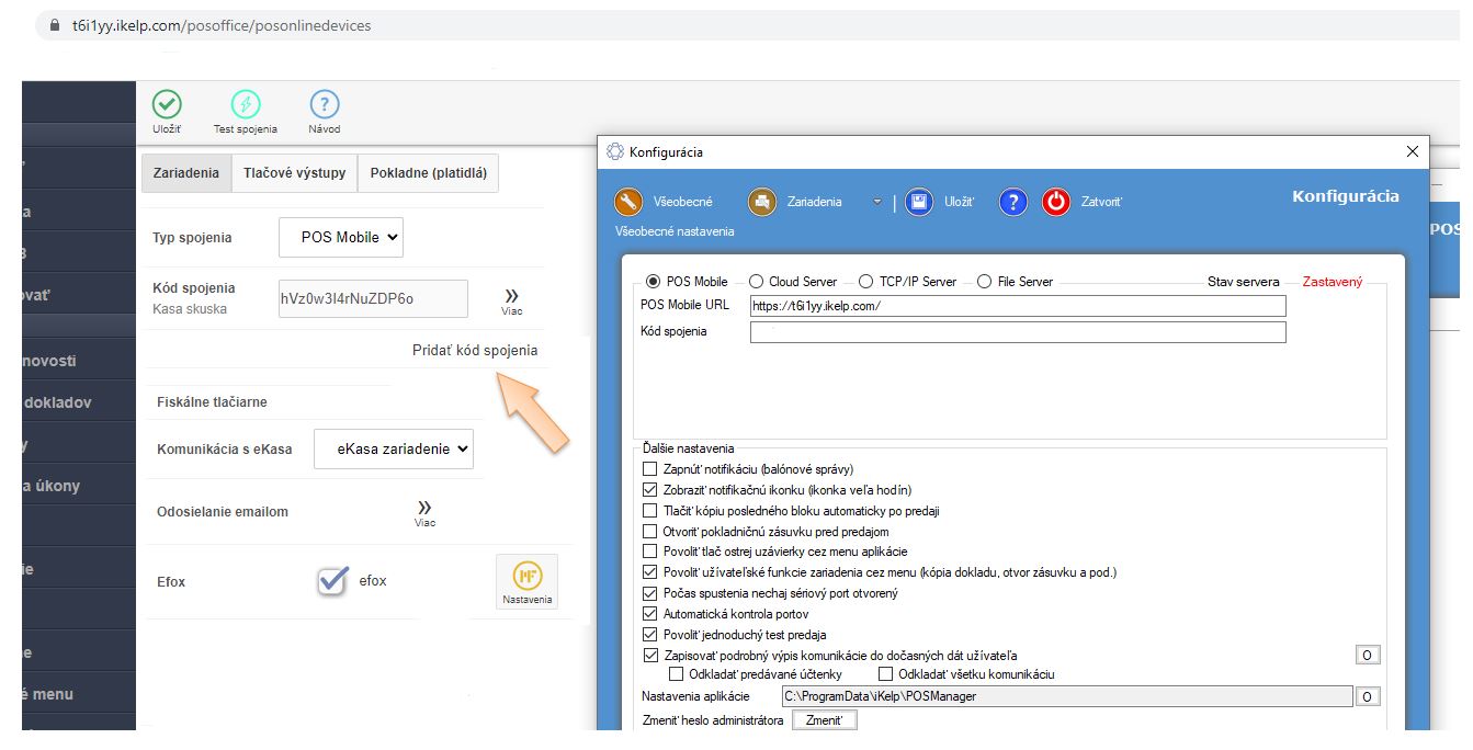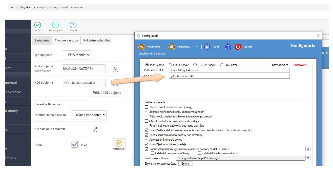 2. Každé pracovisko komunikuje s aplikáciou POS Mobile na základe kódu spojenia. Tento nájdete v aplikácii iKelp POS Mobile v časti Zariadenia.